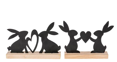 Fém nyuszik, fa alapon, 2 féle. Méretek: 12 x 3 x 10,5 cm, 15 x 3 x 10,5 cm