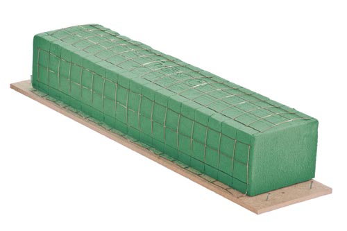 Tisztafa alapra helyezett oázis. Az alaplap kinyúlik, így könnyebben lehet vele dolgozni. 4 db előre montírozott rögzítési lehetőség, 2 db előre fúrt csavarlyuk. Az össz hossza 6 cm hosszabb mint a hozzá illő oázis hossza.
