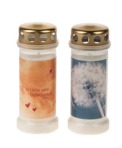 Arany tető, színes minta 'In Liebe und Dankbarkeit' felírattal. Égéstartam 70 óra.