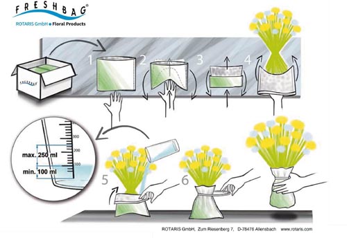 A virágcsokor frissentartó tasak 5 napig képes vizet tartalékolni, Nem folyik ki belőle a víz és újra felhasználható. 100 % - ban recycelt alapanyag.