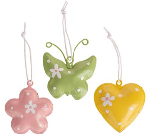 Fém tavaszi figurák akasztón, sárga, rózsaszín, zöld, 6 db, 4 x 4 cm