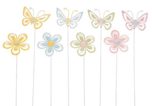 Fém pillangó és virág pálcikán, pasztell keverék, 9 x 9 - 35 cm és 8, 5 x 7 - 33 cm