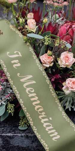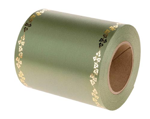 Kiváló minőségű szatén koszorú szalag elegáns nyomott arany szegéllyel (borostyán motívum) különböző szélességekben. Hossza: 25 m.