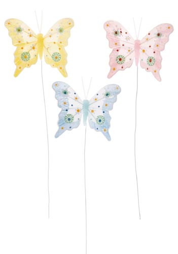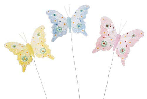 Pillangók, pálcikán, pasztell színek, 12 darab, 8 x 7 - 23 cm