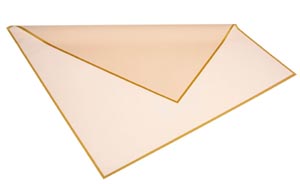 Négyzet alakúra vágott, szatén felületű és enyhén átlátszó fólia 0,5 cm-es arany szegéllyel.